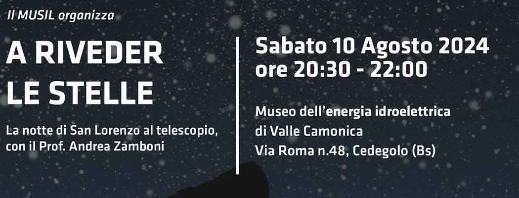 Sabato 10 Agosto 2024 alle ore 20:30 presso il MUSIL – Museo dell’energia idroelettrica di Valle Camonica (in via Roma n.48 a Cedegolo) si terrà “A riveder le stelle. La notte di San Lorenzo al telescopio”, il cielo stellato osservato con il telescopio nella notte più magica dell’anno, la notte di San Lorenzo.