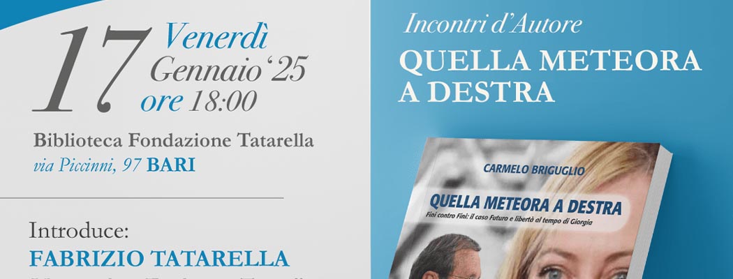 Per la rassegna Incontri d’Autore la Fondazione Tatarella venerdì 17 gennaio 2025 alle ore 18.00 nella Biblioteca della Fondazione (Bari, Via Piccinni n.97) presenta il libro “Quella meteora a destra. […]