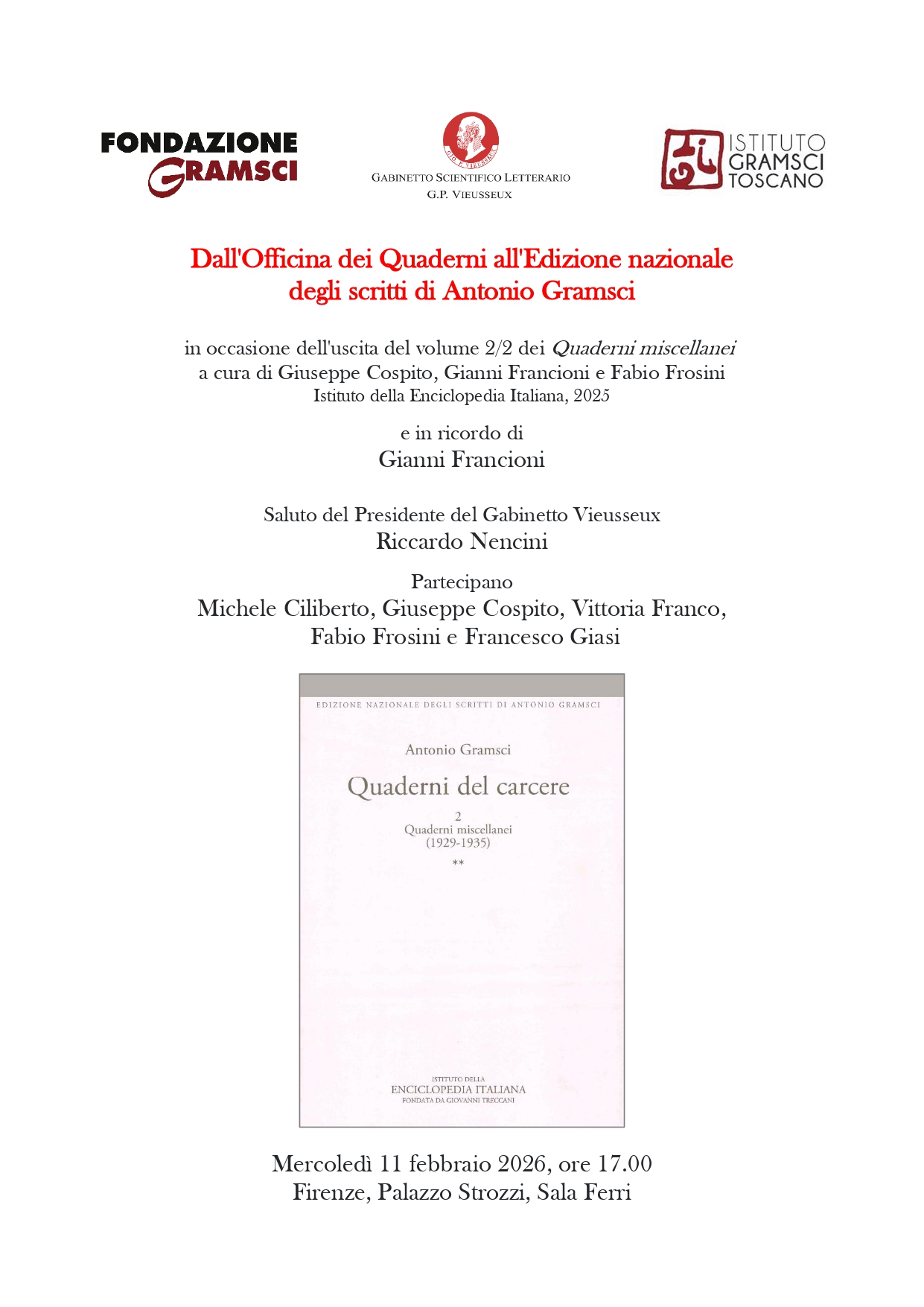 Terza presentazione – dopo Sassari e Roma – del volume 2/2 dei Quaderni miscellanei dell’Edizione nazionale degli scritti di Antonio Gramsci. L’iniziativa promossa dal Gabinetto scientifico-letterario Vieusseux di Firenze, dalla Fondazione Gramsci e dall’Istituto Gramsci Toscano sarà l’occasione per ricordare il magistero e gli studi di Gianni Francioni, il suo impegno per una nuova edizione critica e integrale dei Quaderni del carcere.