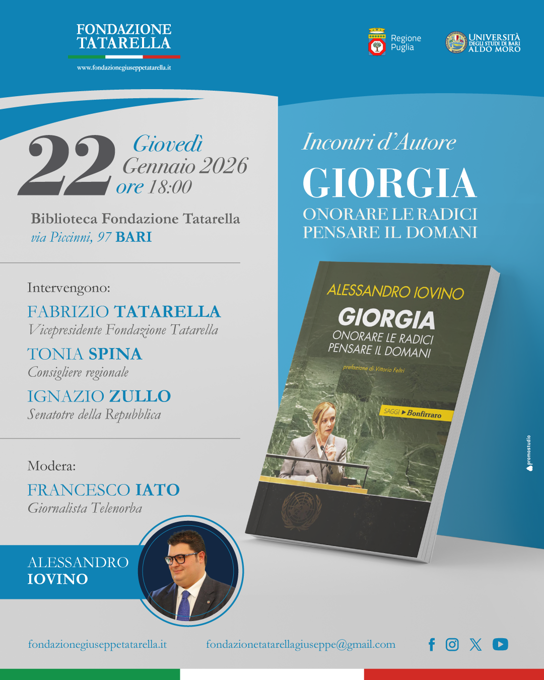 Per la rassegna Incontri d’Autore la Fondazione Tatarella giovedì 22 gennaio 2025 alle ore 18.00, nella Biblioteca della Fondazione (Bari, Via Piccinni n.97), presenta il libro “Giorgia. Onorare le radici, pensare il domani” (Bonifarro Editore) di Alessandro Iovino.