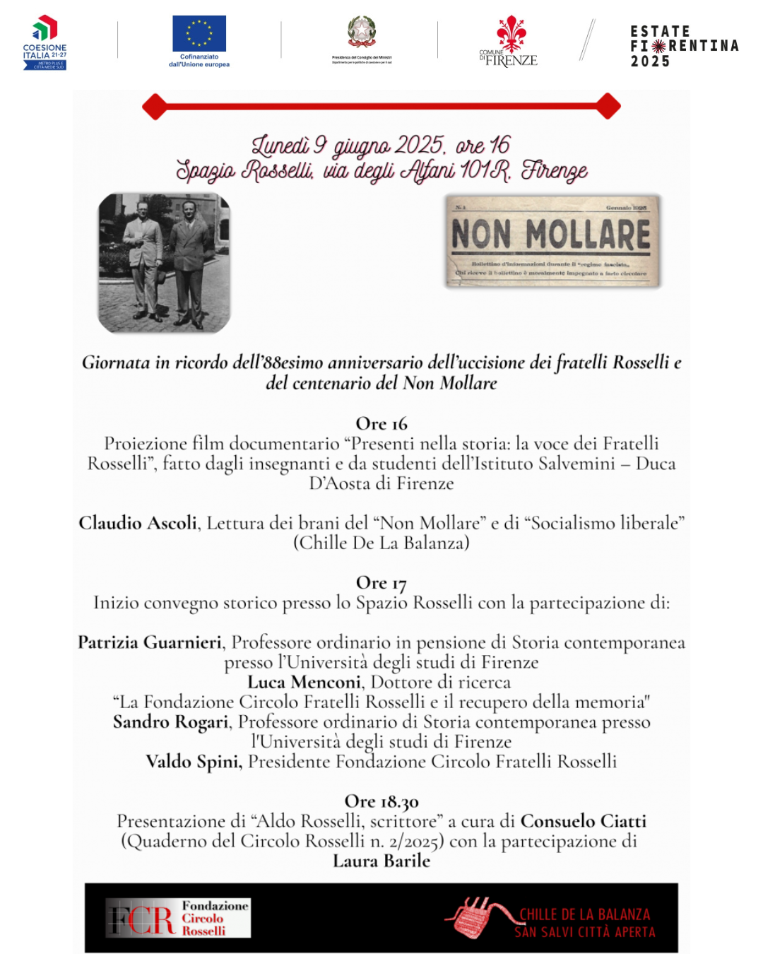 Giornata in ricordo dell’88esimo anniversario dell’uccisione dei fratelli Rosselli e del centenario del Non Mollare – 9 giugno