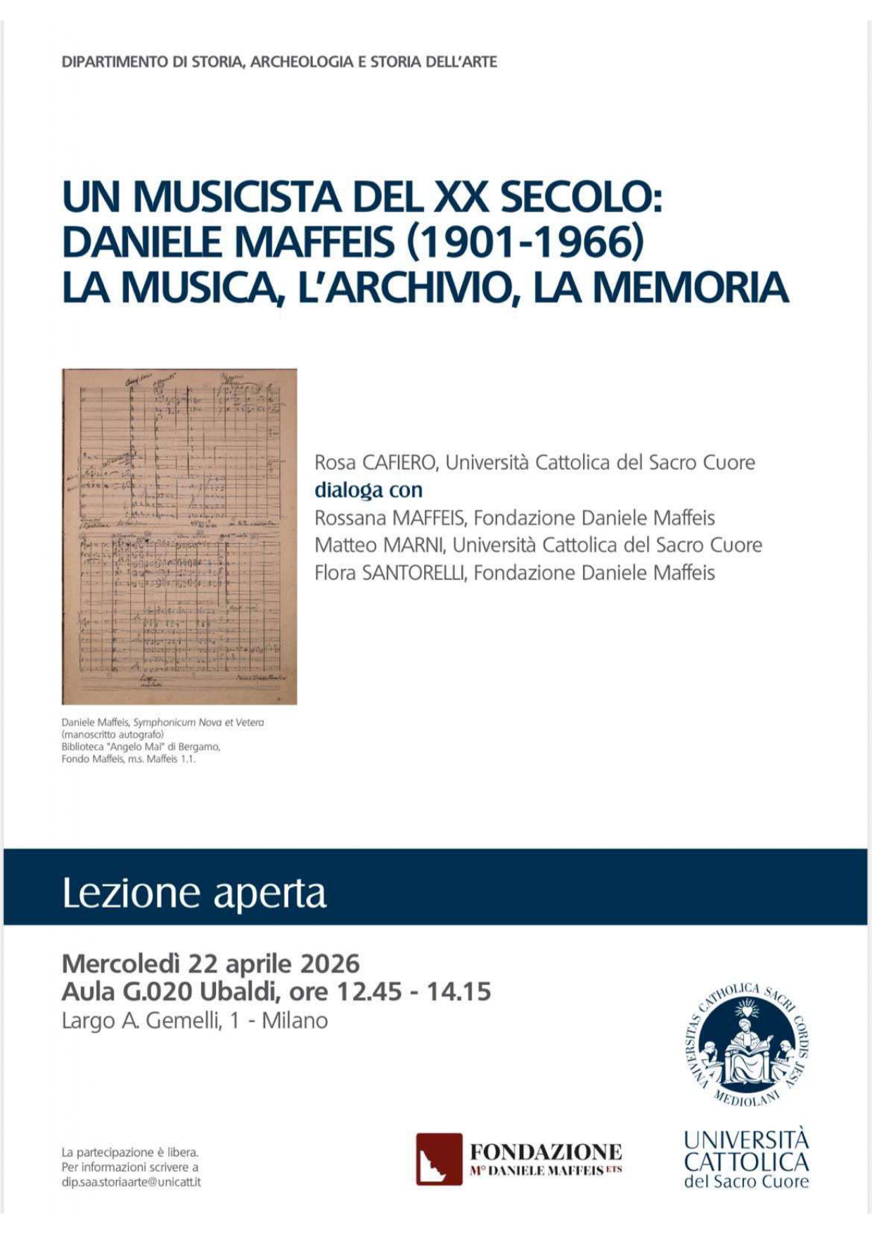 Mercoledì 22 aprile 2026 alle ore 12:45 nell’aula G.020 dell’Università Cattolica di Milano si terrà una lezione aperta nel corso di Storia della Musica dedicata all’archivio di Daniele Maffeis (1901-1966).