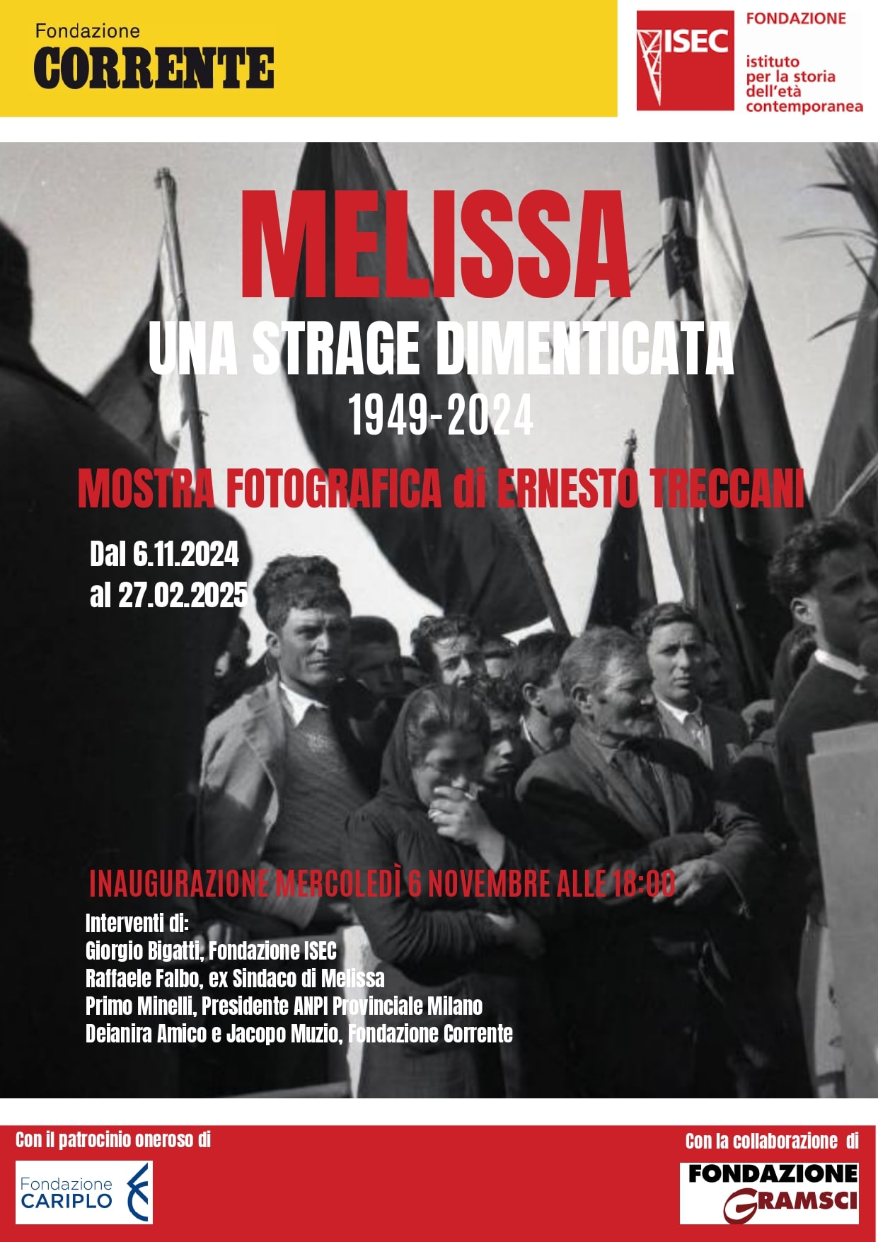 La Fondazione Corrente è lieta di annunciare l’inaugurazione della mostra “Melissa, una strage dimenticata”, dedicata a uno degli eventi più drammatici della storia sociale e politica del Sud Italia del dopoguerra. L’esposizione si terrà presso la sede della Fondazione a Milano dal 6 novembre 2024 al 27 febbraio 2025.