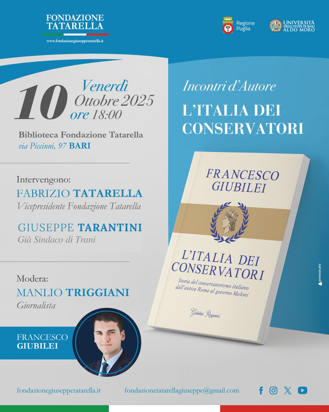 Per la rassegna Incontri d’Autore, la Fondazione Tatarella, venerdì 10 ottobre 2025 alle ore 18.00 nella Biblioteca della Fondazione (Bari, Via Piccinni n.97), presenta il libro “L’Italia dei Conservatori. Storia del conservatorismo italiano dall’antica Roma al governo Meloni” (Giubilei Regnani) di Francesco Giubilei, Presidente della Fondazione Tatarella e Direttore Scientifico della Fondazione An.