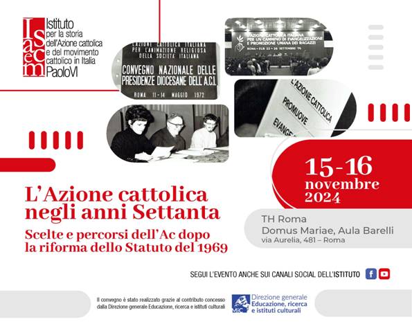 Il 15 e 16 novembre presso l’Aula Barelli della Domus Mariae (TH Roma, via Aurelia 481) l’Isacem, grazie a un contributo concesso dalla Direzione generale Educazione, ricerca e Istituti culturali del Ministero della cultura, promuove il seminario di studio “L’Azione cattolica negli anni Settanta. Scelte e percorsi dell’Ac dopo la riforma dello Statuto del 1969“.