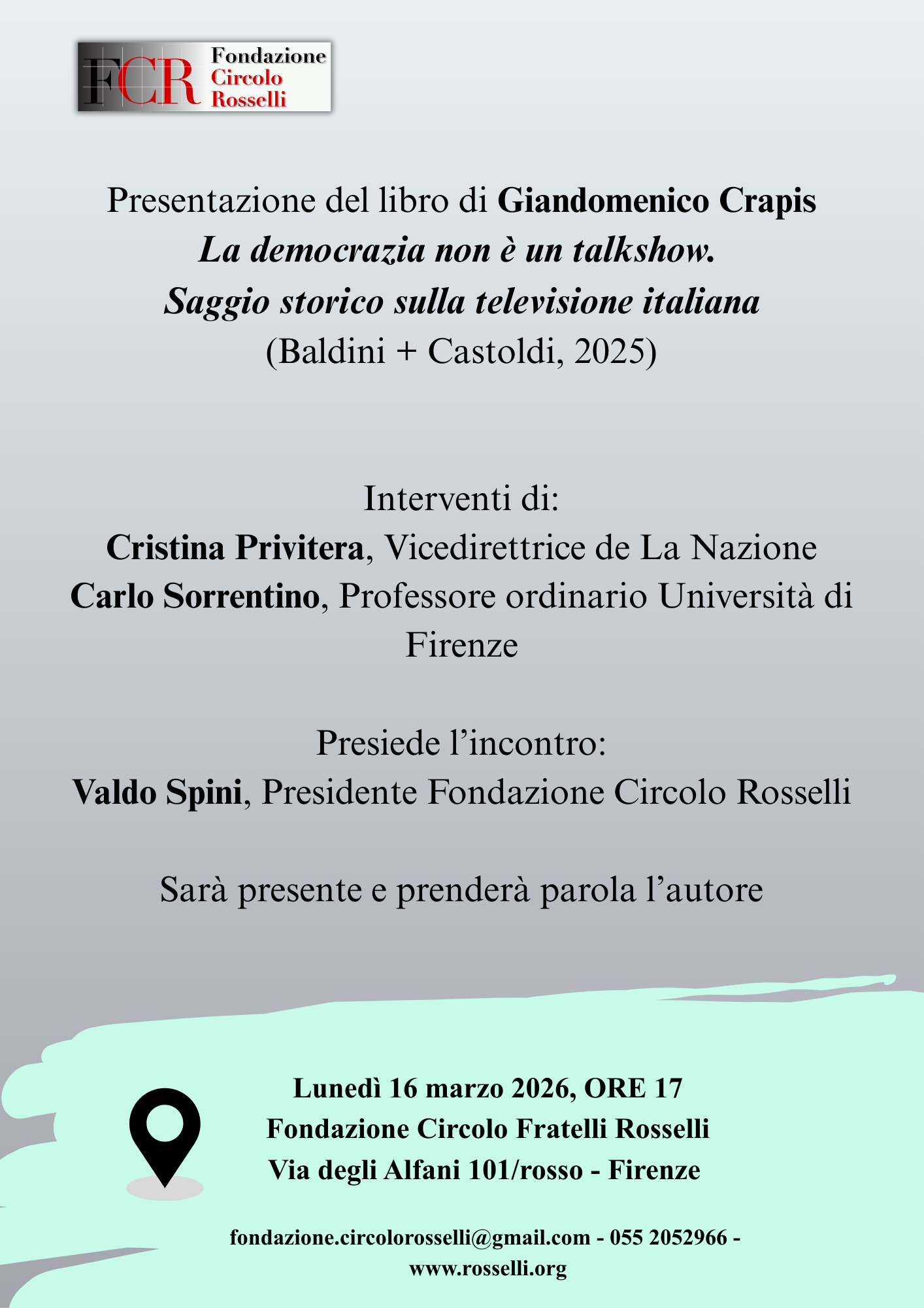 Lunedì 16 marzo 2026, ore 17 (Spazio QCR) – Presentazione del libro di Giandomenico Crapis La democrazia non è un talkshow.