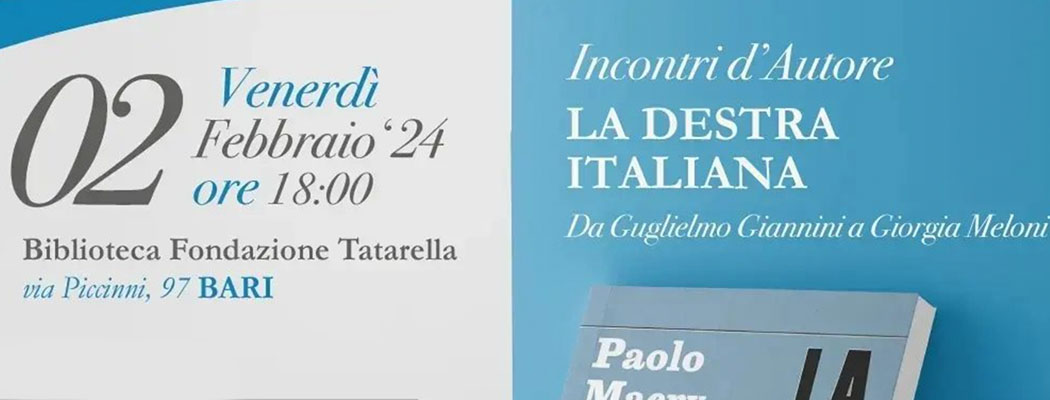 Per la rassegna “Incontri d’Autore”, la Fondazione Tatarella ospiterà il professore di Storia contemporanea dell’Università di Napoli “Federico II”, Paolo Macry per la presentazione del suo ultimo libro “La destra italiana. Da Guglielmo Giannini a Giorgia Meloni”, il 2 febbraio, alle 18.00, nella biblioteca di Via Piccinni, 97.