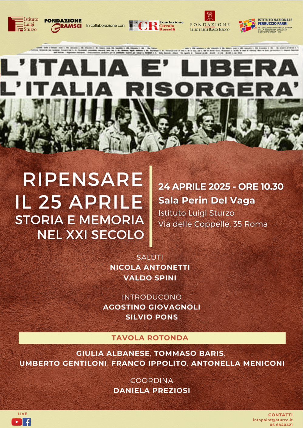 Giornata di studi organizzata in occasione dell’ottantesimo anniversario della Liberazione dall’Istituto Luigi Sturzo e dalla Fondazione Gramsci in collaborazione con la Fondazione Circolo Fratelli Rosselli, la Fondazione Lelio e Lisli Basso e con l’Istituto Nazionale Ferruccio Parri