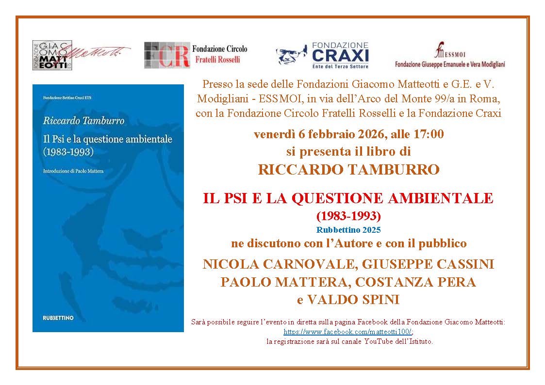 Presso la sede delle Fondazioni Giacomo Matteotti e G.E. e V. Modigliani – ESSMOI, in via dell’Arco del Monte 99/a in Roma, con la Fondazione Circolo Fratelli Rosselli e la Fondazione Craxi